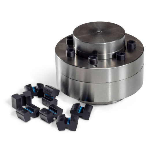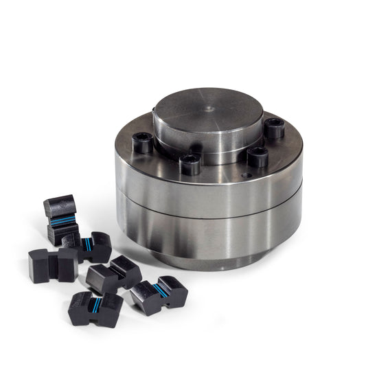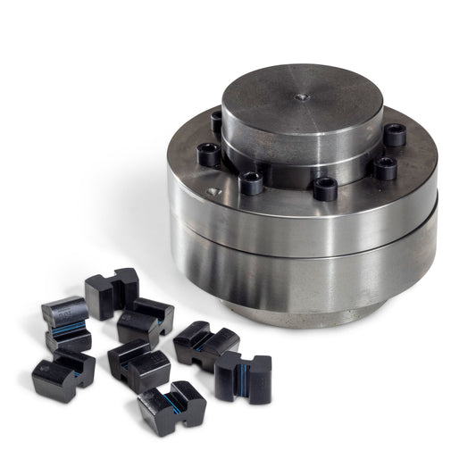 Universally applicable, torsionally elastic damping pin coupling for compensating shaft misalignments. In the three-piece design type A, the bolted pin ring can be loosened and moved, allowing for package exchange without the need to shift the coupled machines.